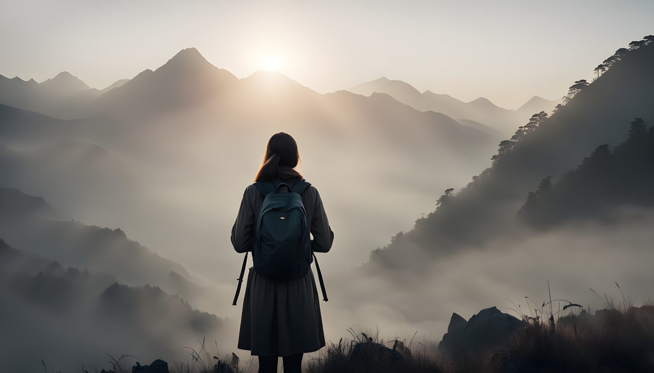 I was invited to create an art for a competition featuring a “moody film style” and I immediately thought of a woman on the top of a mountain looking into the distance on a foggy day. I had recently seen many images of people reaching a mountain top to show they had achieved victory or success, and I had seen images of people helping others up the side of a mountain to show the spirit of teamwork. So I combined thinking of people scaling mountains with the idea of a woman on a mountain being thoughtful and reflective on her life, work, or society today.