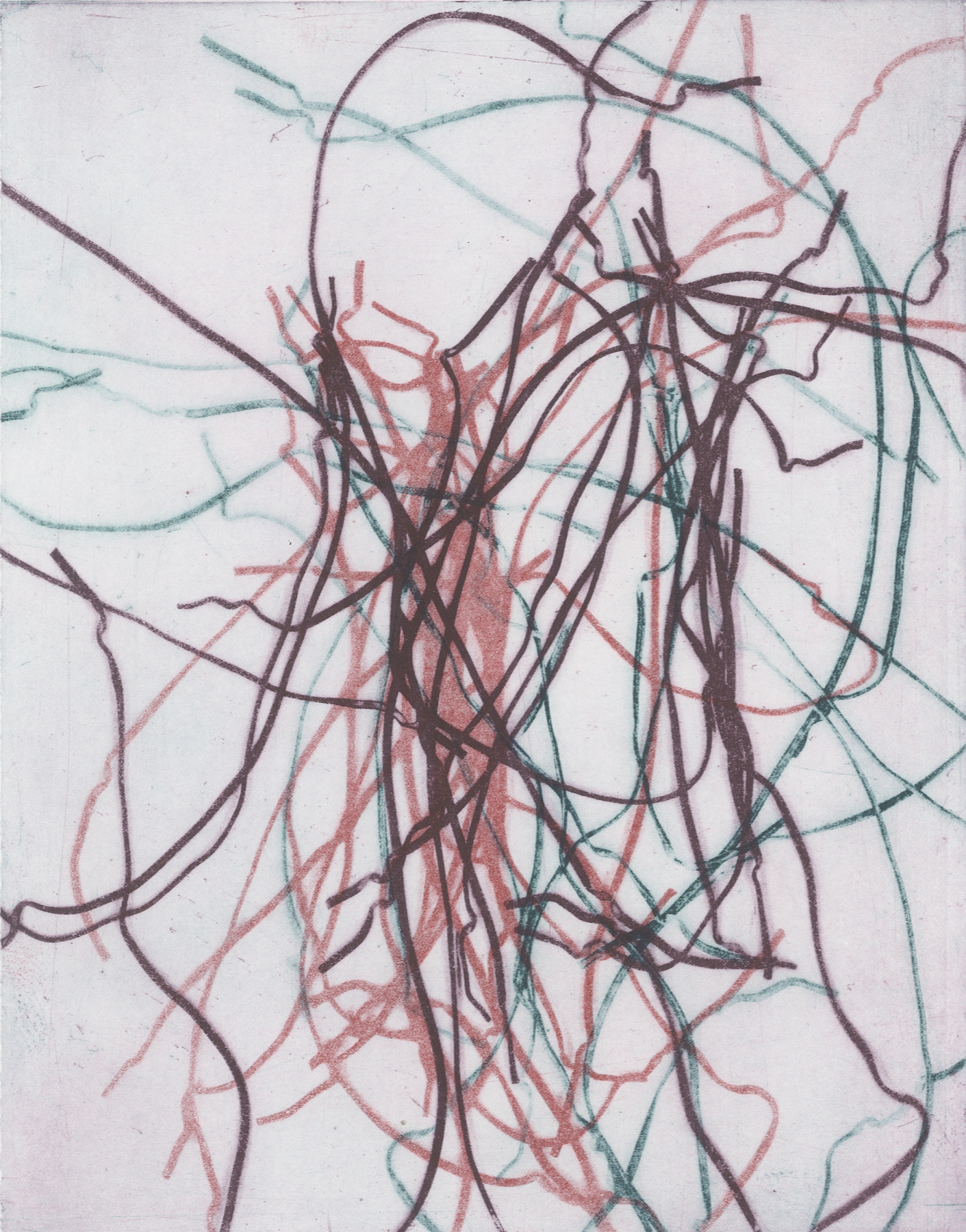 There, aided by 12 studio assistants, Cage created his H/V collection of prints. I watched him direct the assistants to obscure the colors of the cans of ink with paper and bundle copper plates by size. His rationale: “Very simple. To remove the ego from art making.”That day, as low person on the totem pole, I stood far back from the press. After the first piece of paper was rolled through the press, the master printer lifted the press blankets, then the paper to show us the result. As everyone oohed and aahed, I thought— “Oh!! Just a little bit of ego!” Meaning just a tiny bit of choice.