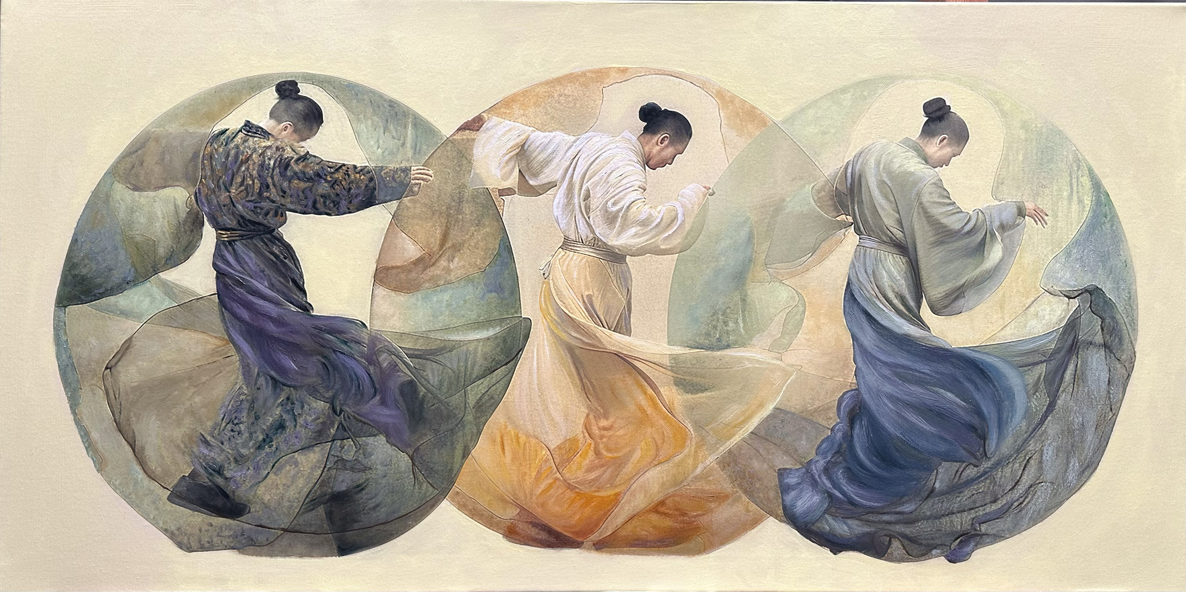“The Dancing Wu Li” is inspired by The Dancing Wu Li Masters by Gary Zukav. The painting blends the grace of human movement with the rhythms of the cosmos. Three dancers, each framed in a circular mandala of color, embody the cyclical flow of cosmic energy. Physics entwines with metaphysics — a dance between logic, wonder and the ineffable.