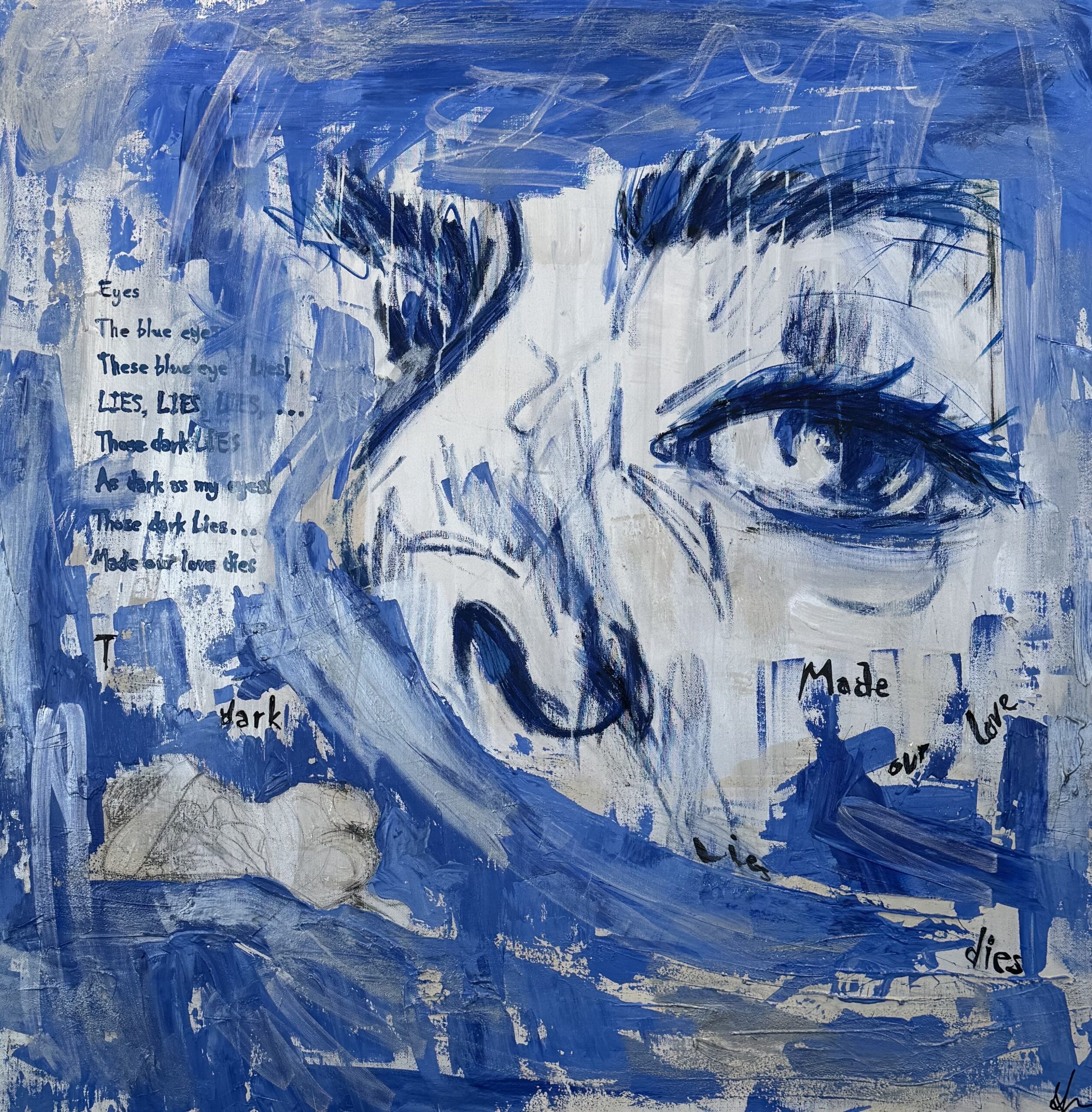 This work was born from grief and betrayal when I discovered the lies behind the blue eyes I once adored. The smashed face and raw words poured out of me in a night of mourning.